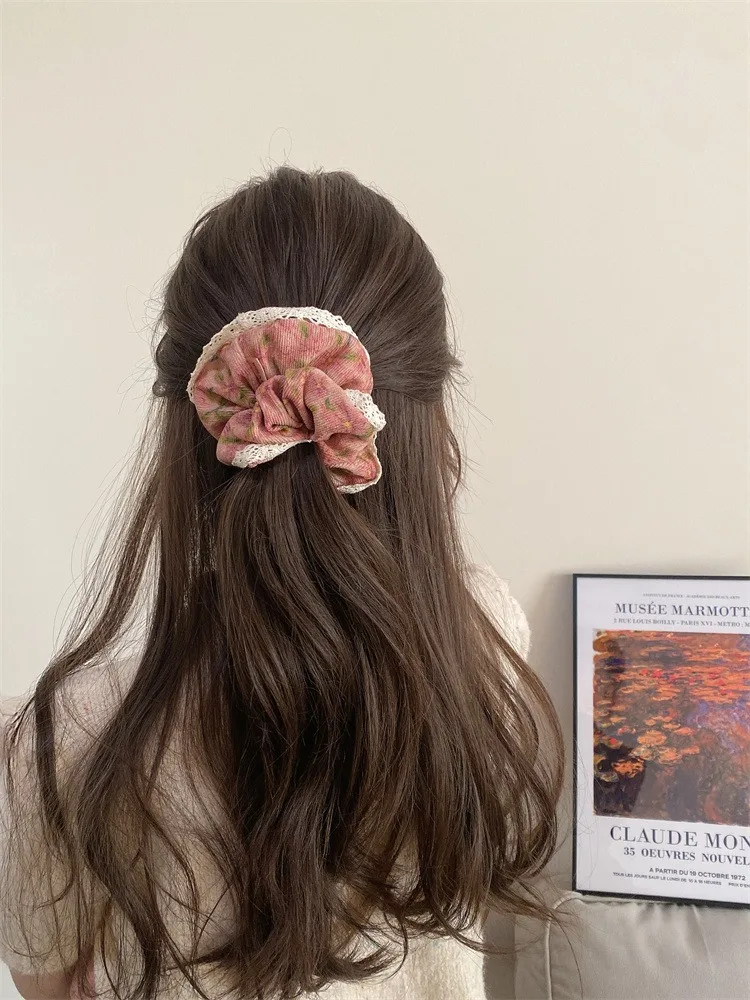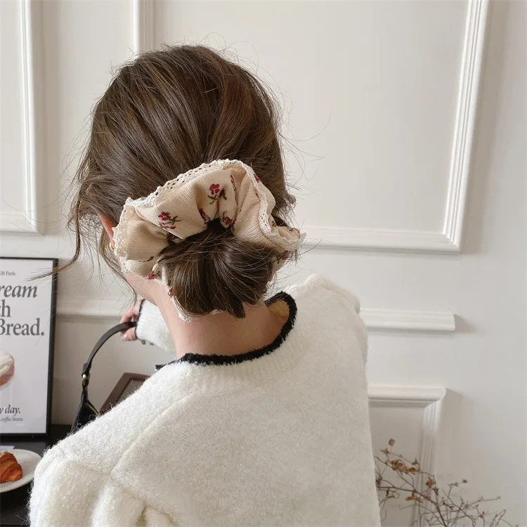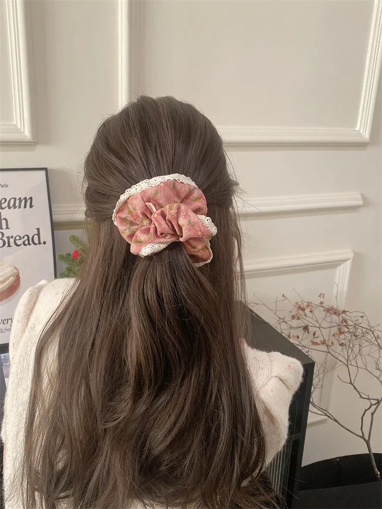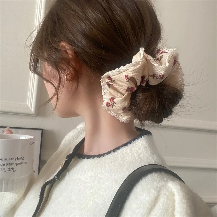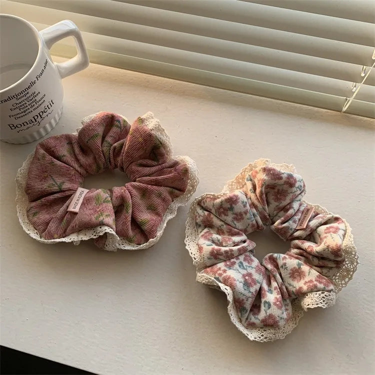 Add a warm, vintage touch to your winter hairstyles with this Corduroy Floral Scrunchie, designed with soft ribbed fabric and delicate lace edging.