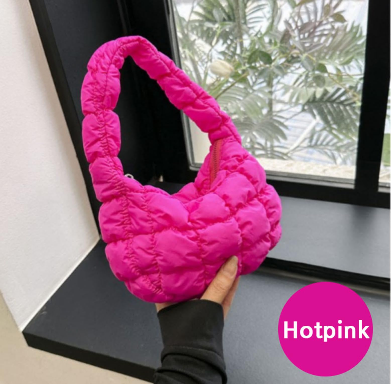 Introducing the Padded Cloudy Mini Tote Bag, a stylish and versatile accessory perfect for all seasons. This lightweight shoulder bag features an eye-catching quilted design with puffy padding that adds both visual interest and soft texture. Measuring 20cm in length, 15cm in height, and 5cm in width, this compact tote is ideal for carrying daily essentials. The bag comes with practical features including two front pockets, one zippered compartment, and three sections for organized storage. The adjustable shoulder strap extends to 15.75 inches, ensuring comfortable wear. Crafted from durable nylon inside and out, this unisex bag combines functionality with contemporary style. Available in a range of colors including white, black, light pink, hot pink, green, purple, and blue, this casual tote complements any outfit. The rectangular silhouette and solid pattern create a clean, modern look, while the front buckle details add a distinctive touch. Note that the quilted pattern may vary slightly based on production. With its 3-liter capacity and practical design, this mini tote is perfect for everyday use, shopping trips, or casual outings.
