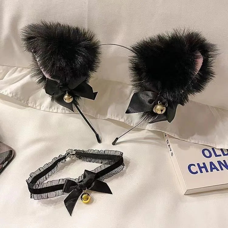 Sexy Cat Ears Headband for Women Girls Lace Bow Necklace Plush Bell Hairband Cosplay Masquerade-Party Costume Hair Accessories